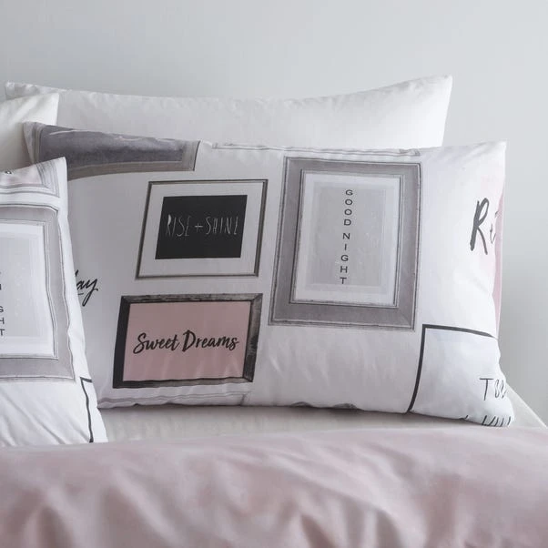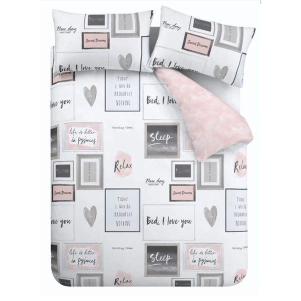 Relax in a contemporary soft blush pink & grey palette with this duvet cover and pillowcase set. Boasting a feel good print that features fun, cute on trend quotes, this set turns your bedroom into a happy zone with positive vibes! Turnover to a soft blush pink reverse – when nothing but pink will do! This set is available in a range of sizes.