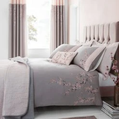 Give your bedroom an elegant update with the Embroidered Blossom bed-linen expertly designed and created in Great Britain by Catherine Lansfield, renowned for style and quality. Beautiful branches of pink cherry blossom are embroidered onto a grey backdrop. With a soft satin sheen, this oriental style bed-linen has a sophisticated elegance that harks back to eastern influences found in early 20th century design. Pair with the matching bedspread and boudoir cushion to complete the look.