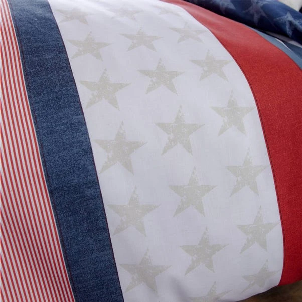 Catherine Lansfield is renowned for style and quality with their products being designed and developed in Great Britain. Take a trip across the Atlantic to USA with Catherine Lansfield’s Stars and Stripe collection. Fly the flag for a classic children’s look with this cool on trend stars and stripes duvet set. Bands of red, white and blue patterns cover the front, whilst the reverse is blue with a faded star print. This duvet set is fully reversible with a button fastening.