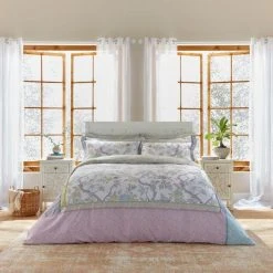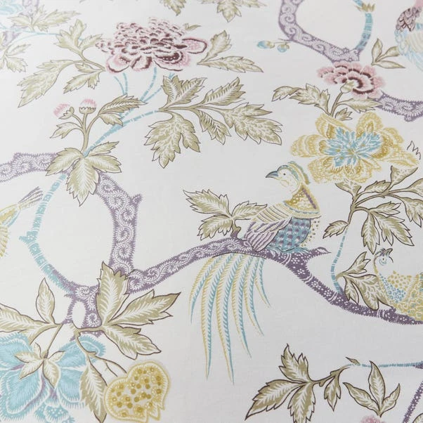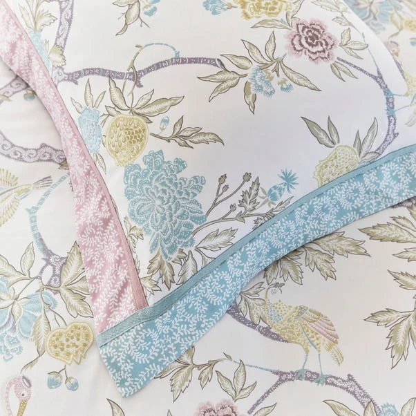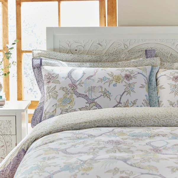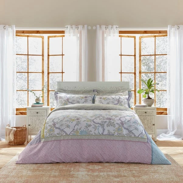 Delightful oriental florals lend this smooth sateen bedding a depth and beauty that will refresh your bedroom style. Printed onto 100% cotton sateen and on a 300 thread count fabric, the soft colours of purples, greens, and blues are playfully inspired by exotic gardens. The distinctive panel design is finished with ribbon detailing. Complete with a gorgeous cotton sateen tape detailing for a luxury finish and a secure zip closure to give you a dreamy night sleep. Coordinating pillowcase pairs are available to purchase separately.