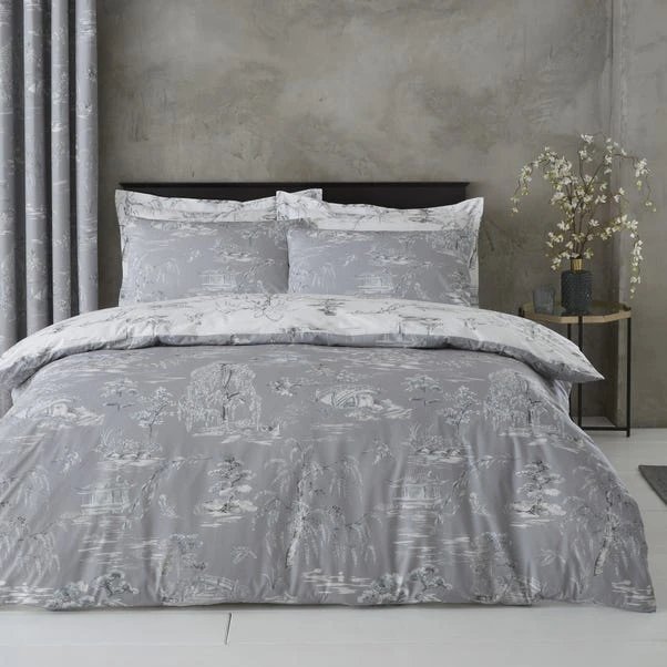 The Chinoiserie duvet cover and pillowcase set features an intricate East Asian design. With dainty trees and architecture over the water, alongside oriental birds flying here and there, this grey set with crisp white reverse is classy and trendy. The look is complete with our Chinoiserie cushion and runner, creating an absolutely stunning sleep space. Crafted using a combination of natural and synthetic that ensure comfort and durability, with a soft touch finish and easycare properties.