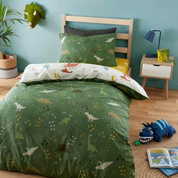 Time for your little one to go on a dinosaur adventure. With a fun dinosaur design, this duvet cover and pillowcase set has a reversible design that is interchangeable for quick style changes. Crafted from a polycotton material, the set is easy to care for and is fully machine washable. The duvet cover set has been finished with a button closure which helps secure the cover around the duvet whilst in use. Pair the duvet cover with the matching fitted sheets for a coordinated look.