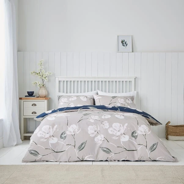 An oriental feel floral printed design cascades across this duvet cover. Featuring a rich navy colourway, the front will add a stylish look into your bedroom. A natural ground reverse provides the option for a style change when desired. Crafted from a polycotton material, the set is easy to care for and is fully machine washable. The duvet cover set has been finished with a recycled plastic button closure which helps secure the cover around the duvet whilst in use.