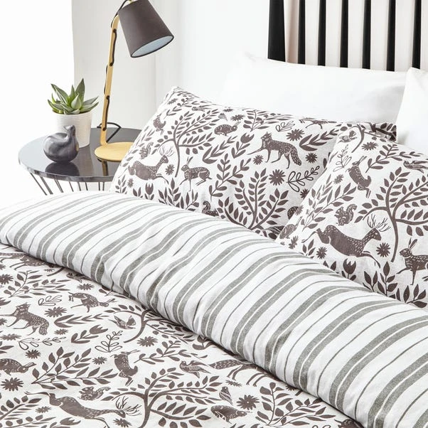Gain an impossibly comfortable sleep with this duvet cover set is composed of 100% cotton which has a digitally printed design. The design features a minimalist Scandinavian woodland print with a striped reverse. A clear button closure allows an easy duvet cover removal.