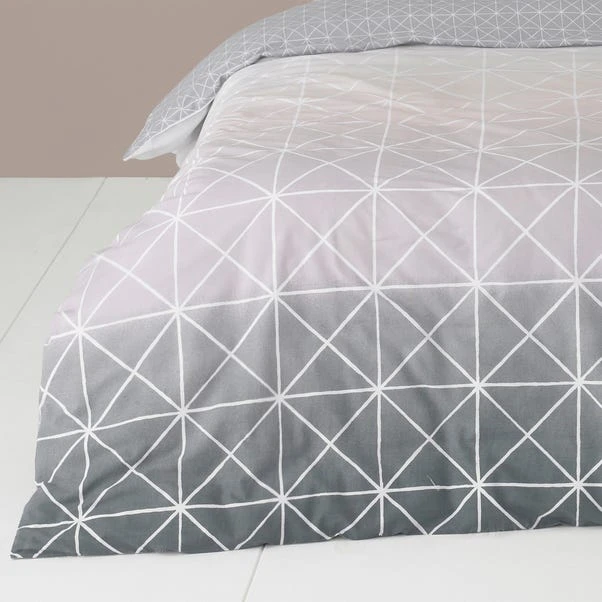 With a stylish ombre effect and a geometric line design on a pink, grey and white gradient, this duvet cover and pillowcase set is perfect for adding a stylish and modern touch to your bedroom. Made of crisp polycotton this duvet cover and pillowcase set is super soft and hard-wearing. This bedding set is machine washable and features clear buttons for easy closure.