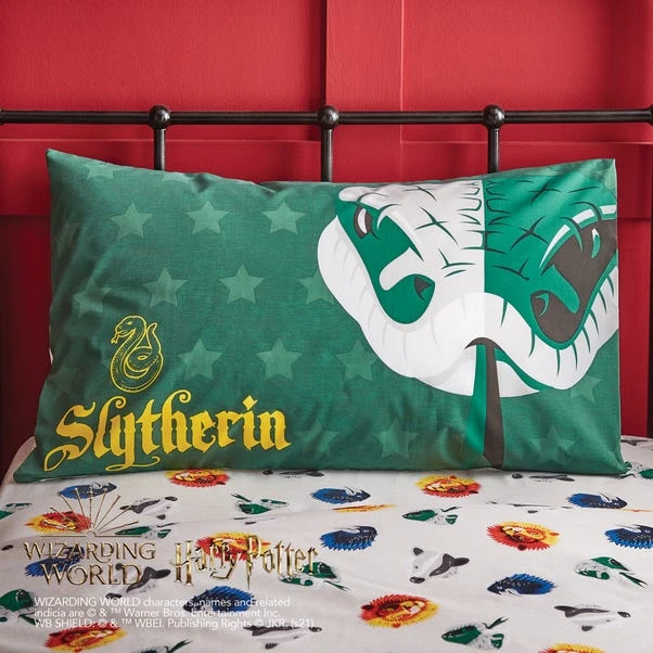 Add a touch of magic to your little one’s room, with this Harry Potter Slytherin Duvet Cover and Pillowcase Set. With a fully reversible design, this bedding set features two Slytherin inspired prints. Made from polycotton this bedding set is soft, durable, and machine washable. Other Harry Potter house inspired duvet cover sets are also available as well as other coordinating Harry Potter accessories.