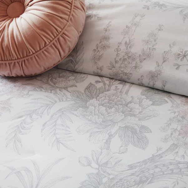 Holly Willoughby brings you a modern duvet cover set that features outlined exotic birds in an Chinoiserie style. A grey on white colourway is paired perfectly with pastel elements to give this set a delicate touch. Turn the duvet cover set over to reveal an alternate style to quickly give your room a new look. With a 180 thread count, this set has been crafted using a luxurious 100% cotton percale that is soft to touch. The cover has been finished with a button fastening that helps secure the cover around the duvet while in use.