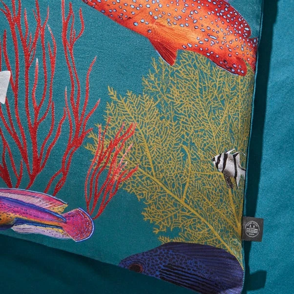 This colourful coral Reef inspired bedding design is part of our Natural History Museum collection. The quilt cover set features brightly coloured tropical fish swimming amongst sea urchins, starfish and beautiful coral, all set against a rich blue background colour. Made in 100% Better Cotton, which is naturally moisture absorbing making it the perfect choice for a restful night’s sleep. Quilt cover sets available in a range of sizes.