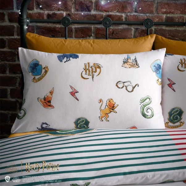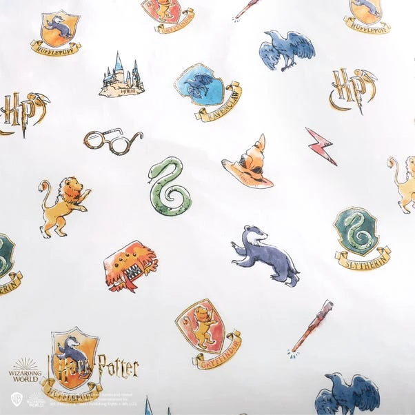 Perfect for your little wizard, this duvet cover and pillowcase set is designed in a Harry Potter Houses print. With a colourful print, this duvet cover set has a reversible design which is interchangeable for a quick change, so your little Hogwarts lover will never get bored of their bedding! Made from a soft and cosy blend of recycled polycotton which is easy to care for being machine washable. This set is finished with a secure button fastening for an uninterrupted night sleep and comes complete with matching reversible pillowcase(s). Available in other sizes too!